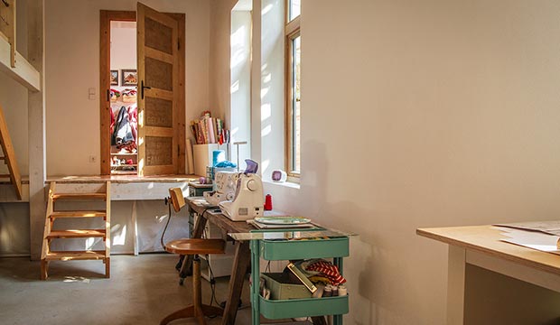 Alex: Das Dach über dem Ausbau haben wir mit Zellulosefasern isoliert. Das haben wir mit der Firma K3 Dämmservice gemacht. Ich hatte vorher zwischen die Sparren mit Holzweichfaserplatten und Folie Kästen gebaut, in die dann die Zellulose reingepustet wurde. Unterm Dach ist so in der Schräge über dem Atelier mein Büro entstanden. Eigentlich wollten wir das erst irgendwann später machen, doch als wir fast fertig waren mit dem Ausbau des Ateliers haben wir gemerkt, wie schön es ist, wenn auch von oben Licht ins Atelier fällt und so haben wir kurzfristig noch den Ausbau des kleinen Dachteils rangehängt. Was dann insgesamt nochmal 6 Monate gedauert hat.