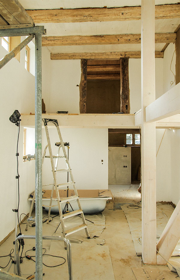 Bei Umbauten, bei denen man viel Eigenarbeit leistet, sollte man auf keinen Fall die Arbeitssicherheit vergessen. Vor allem bei Arbeiten in der Höhe, auf einem Dach, Gerüst oder Leiter sollte man sich professionell sichern. Auch gute Arbeitsschuhe, Handschuhe und Mundschutz sind extrem wichtig.