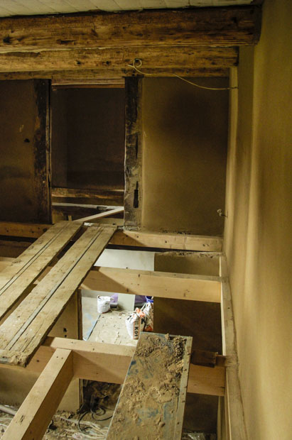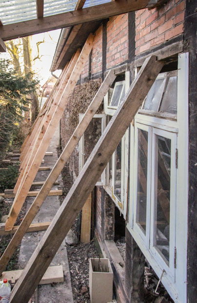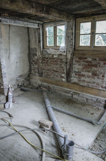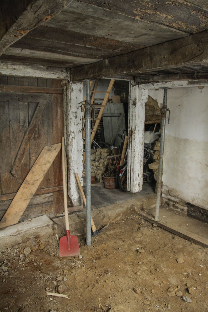 Zuerst musste der als Gästezimmer genutzte vordere Raum des Ostflügels komplett entkernt werden. Erst da wurde sichtbar, dass die Holzschwelle auf der gesamten Ostseite marode und an vielen Stellen weggefault war. Auf dieser Schwelle stehen die gesamten Ständer des Fachwerks und ein Neuaufbau macht nur Sinn, wenn die Schwelle ausgetauscht wird. Für dieses Projekt mussten die Ständer alle von außen abgestützt werden, so dass das Gewicht des Hauses dann nicht mehr auf der Schwelle ruhte. Erst dann konnten die unteren Gefache herausgenommen und die alte Schwelle herausgeschnitten werden. Diese Arbeiten wurden von der auf alte Holzbauweisen spezialisierten Firma Holzverbindung ausgeführt. Andere Arbeiten wie das Entkernen haben die beiden selber gemacht.