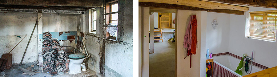 Steffi: Eigentlich war unser Badezimmer der Anlass für den Umbau, denn in unserer Wohnung gab es nur ein sehr kleines Badezimmer von etwa 5 Quadratmetern mit einer winzigen Dusche. Als die Kinder zur Welt kamen, hatten wir den Wunsch nach einem größeren Bad mit Wanne, doch lange Zeit war nicht klar, wo dieses Badezimmer entstehen könnte. Wir hatten damals eigentlich geplant, eines Tages mal das Dach der Tenne auszubauen. Doch allein ein neues Dach hätte mindestens 30.000 Euro gekostet plus die Kosten für den Ausbau.