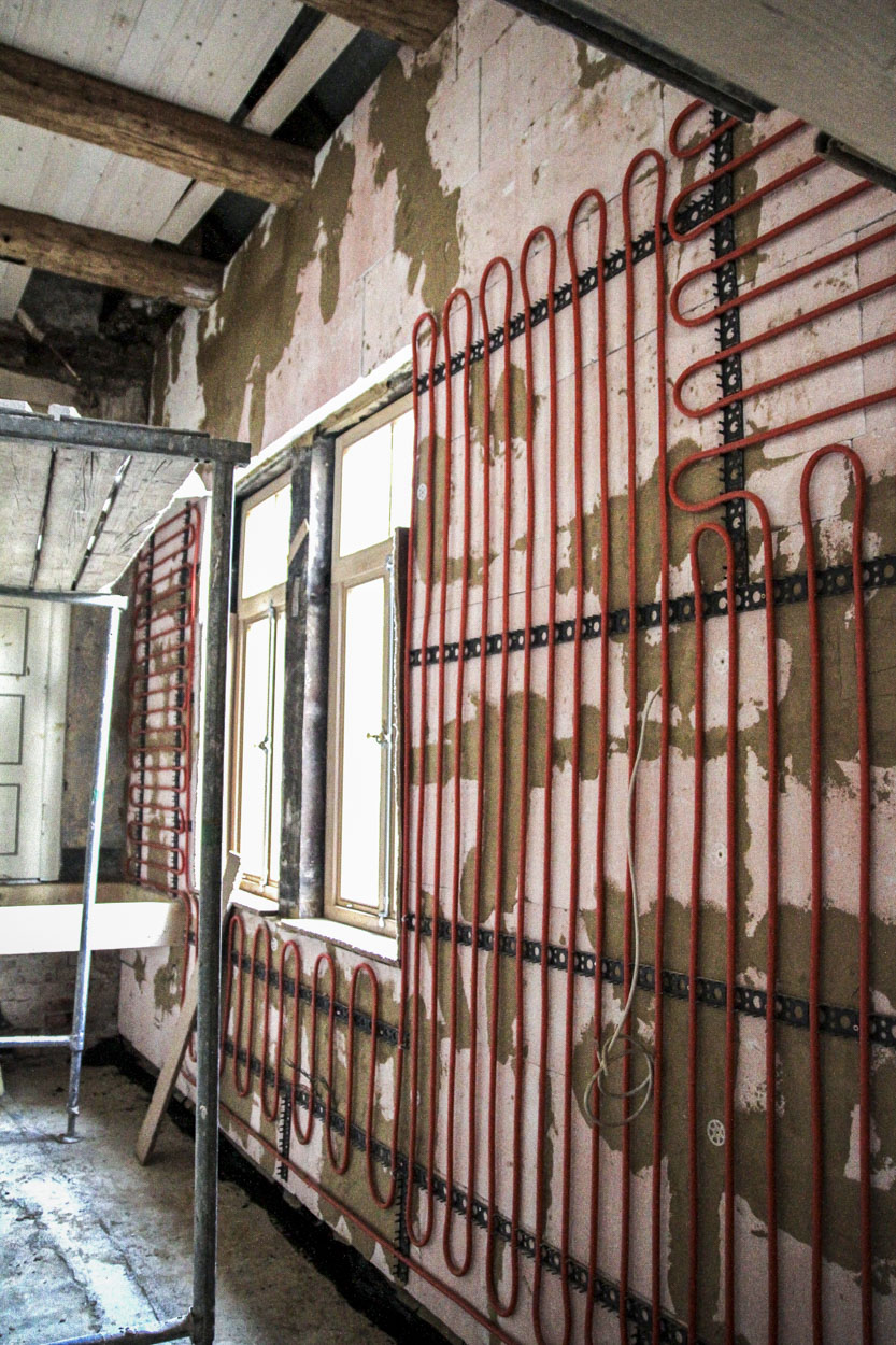 Alex: Da wir von außen unbedingt das Fachwerk erhalten wollten, kam eine Dämmung von außen nicht in Frage. Wir mussten also die Dämmung irgendwie innen anbringen. Beim Entkernen hatte ich entdeckt, dass in den inneren Gefachen noch die alten Lehmziegeln verbaut waren und das Ganze mit Lehm verputzt war. Beim Besuch Umbau-Messe hatte ich dann Herrn Schade kennen gelernt, den Chef der Firma SMB, die sich schon vor über 25 Jahren auf das Arbeiten mit Lehm spezialisiert hatte. Zusammen mit ihm haben wir dann das Wärme- und Energiekonzept entwickelt. Das Herzstück sind Wandheizungsrohre, die komplett in Lehm liegen und über die erwärmte Wand eine wunderbare Strahlungswärme abgeben.