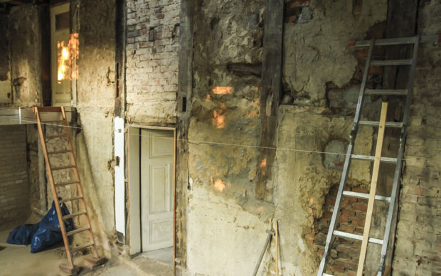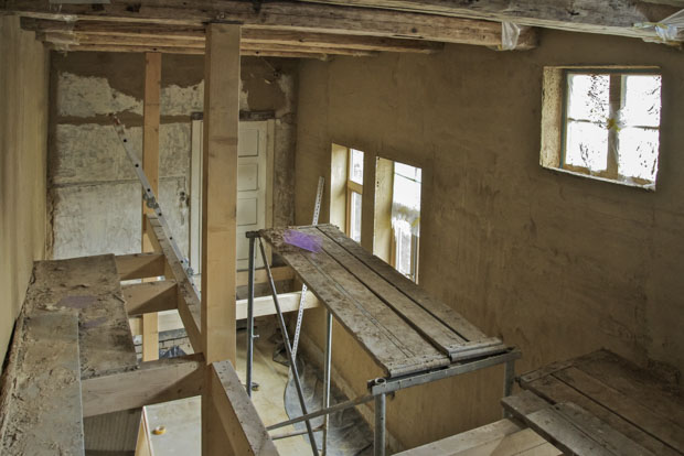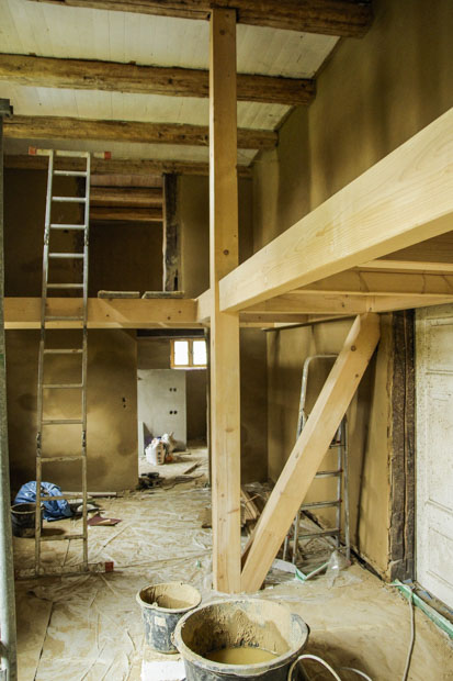 Zuerst musste der als Gästezimmer genutzte vordere Raum des Ostflügels komplett entkernt werden. Erst da wurde sichtbar, dass die Holzschwelle auf der gesamten Ostseite marode und an vielen Stellen weggefault war. Auf dieser Schwelle stehen die gesamten Ständer des Fachwerks und ein Neuaufbau macht nur Sinn, wenn die Schwelle ausgetauscht wird. Für dieses Projekt mussten die Ständer alle von außen abgestützt werden, so dass das Gewicht des Hauses dann nicht mehr auf der Schwelle ruhte. Erst dann konnten die unteren Gefache herausgenommen und die alte Schwelle herausgeschnitten werden. Diese Arbeiten wurden von der auf alte Holzbauweisen spezialisierten Firma Holzverbindung ausgeführt. Andere Arbeiten wie das Entkernen haben die beiden selber gemacht.